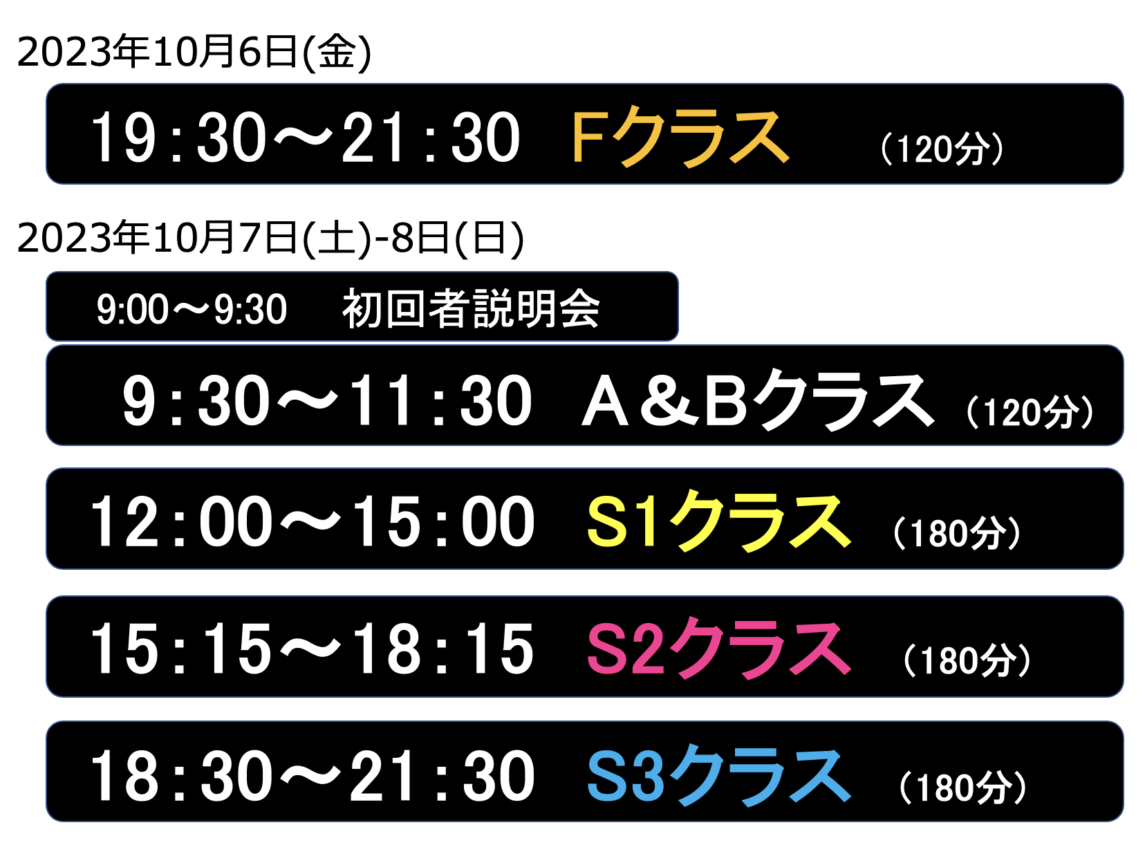 ※10/6のFクラスと、10/7-8の各クラス併用は各クラスの人数次第となりますので、お問い合わせください。