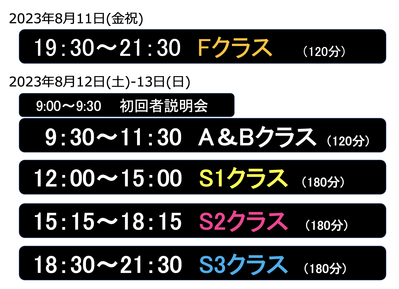 ※8/11のFクラスと、8/12-13の各クラス併用は各クラスの人数次第となりますので、お問い合わせください。
