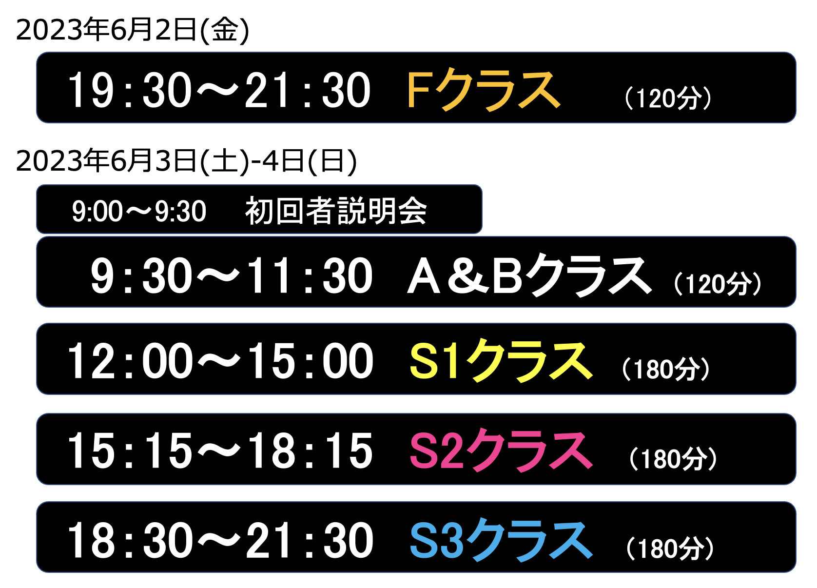 ※6/2のFクラスと、6/3-4の各クラス併用は各クラスの人数次第となりますので、お問い合わせください。