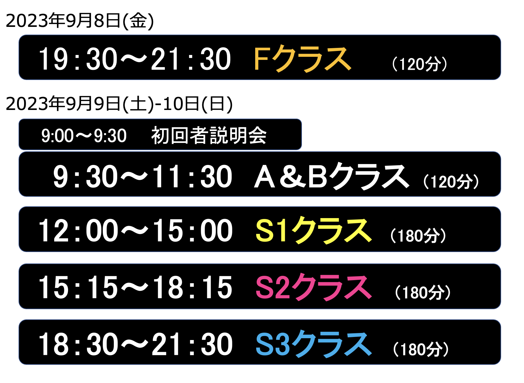 ※9/8のFクラスと、9/9-10の各クラス併用は各クラスの人数次第となりますので、お問い合わせください。