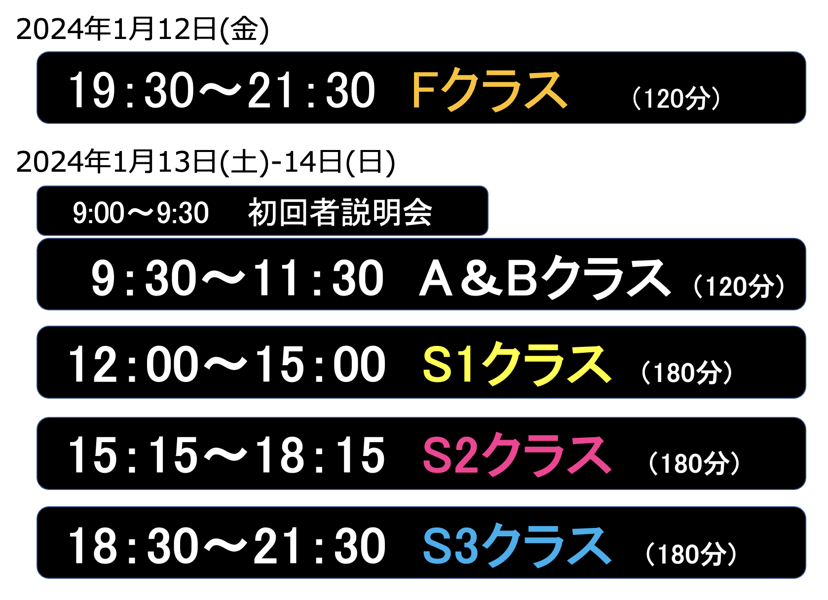 ※1/12のFクラスと、1/13-14の各クラス併用は各クラスの人数次第となりますので、お問い合わせください。