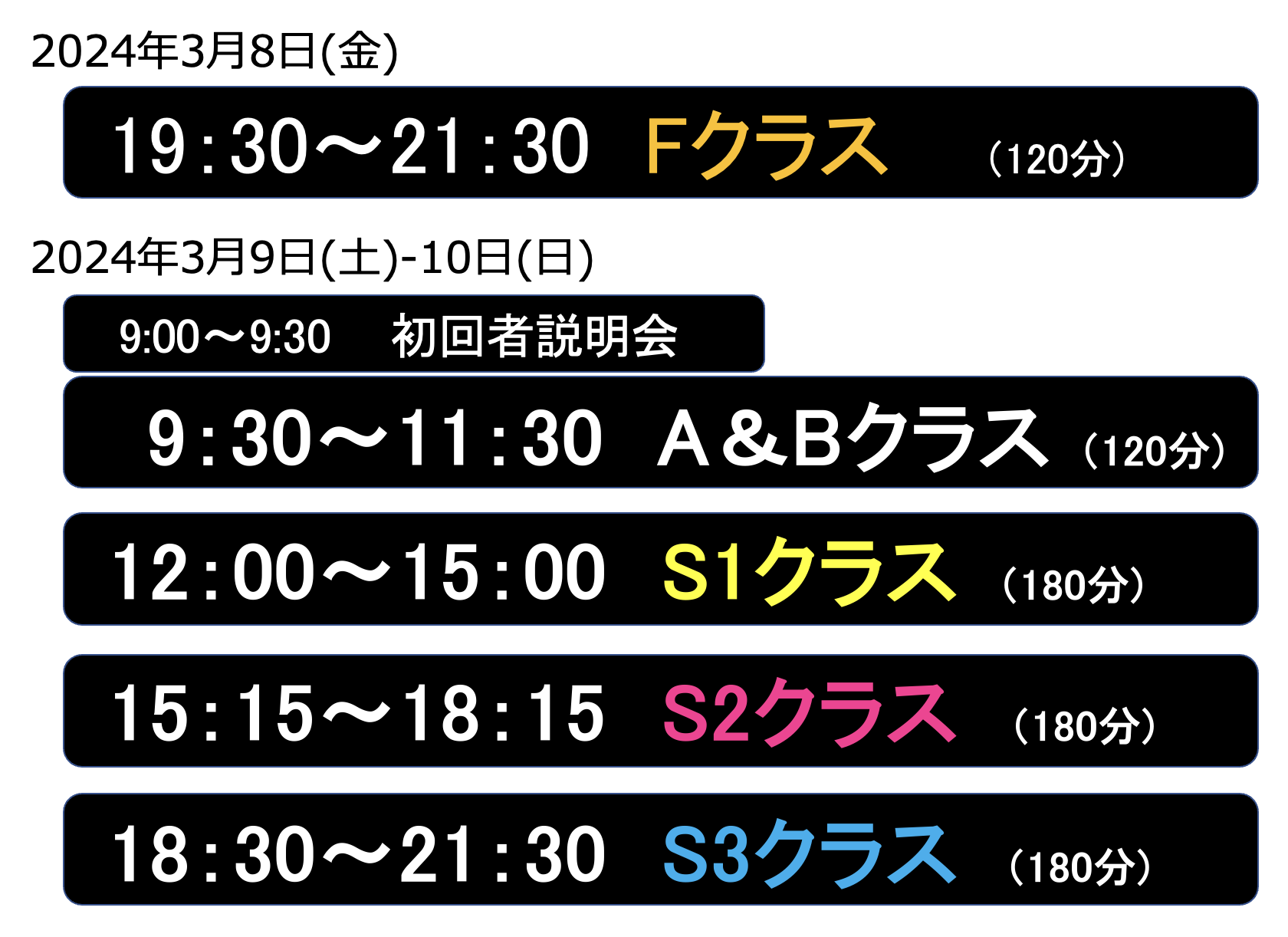 ※3/8のFクラスと、12/1-2の各クラス併用は各クラスの人数次第となりますので、お問い合わせください。