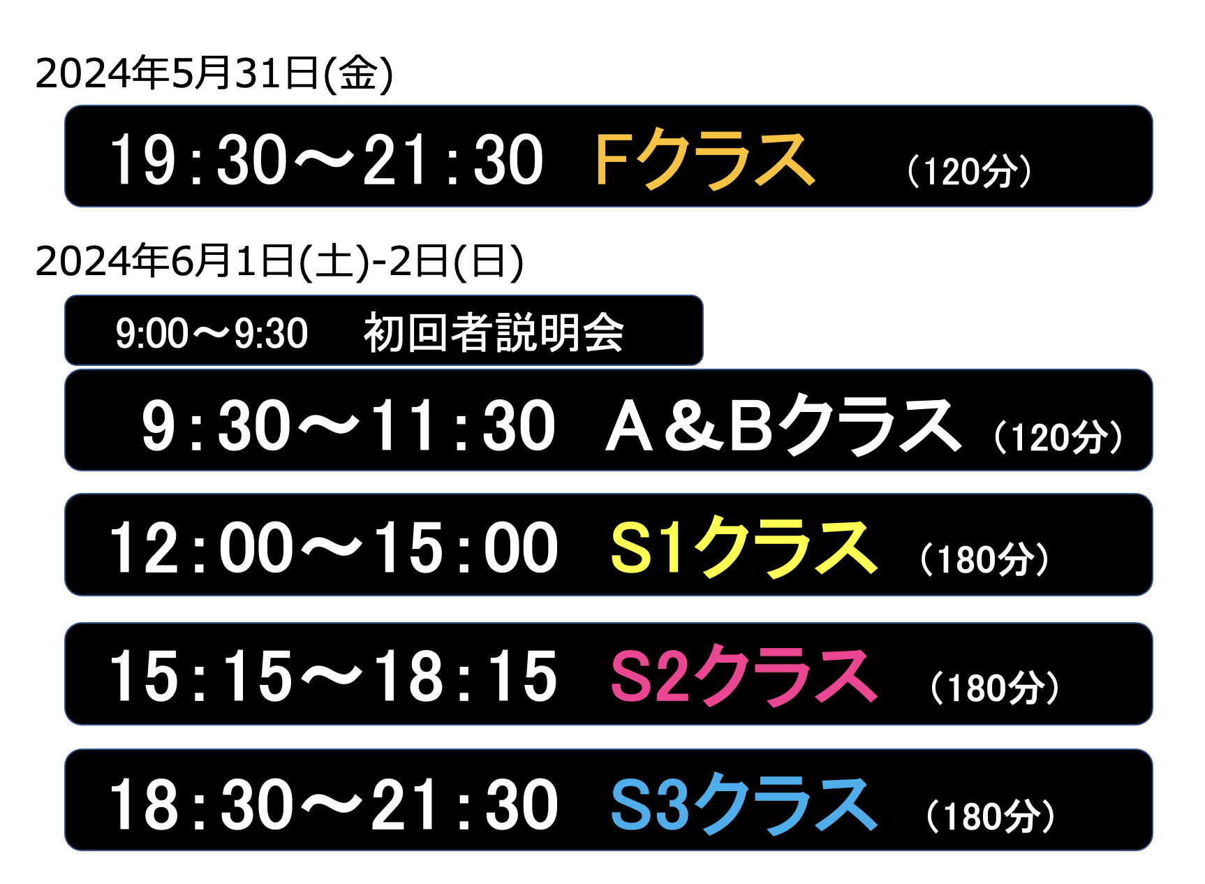 ※5/31のFクラスと、6/1-2の各クラス併用は各クラスの人数次第となりますので、お問い合わせください。