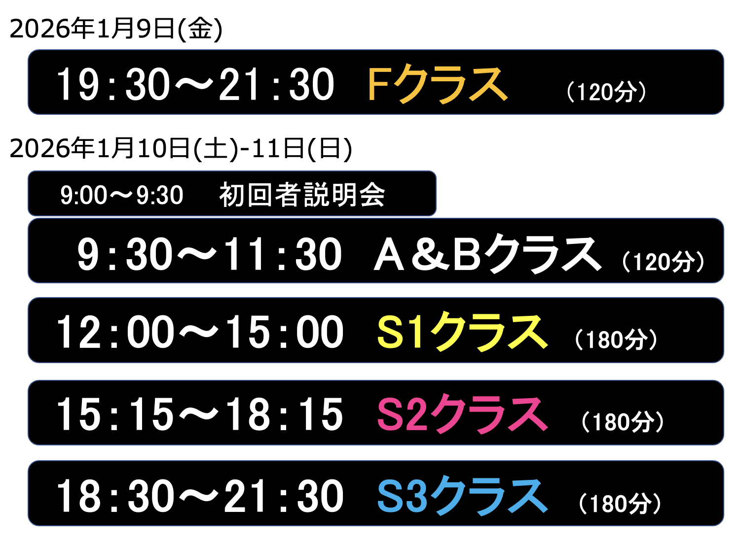 ※ Sクラスは基本、両日の受講が必須となります。(難しい場合はご相談下さい。)